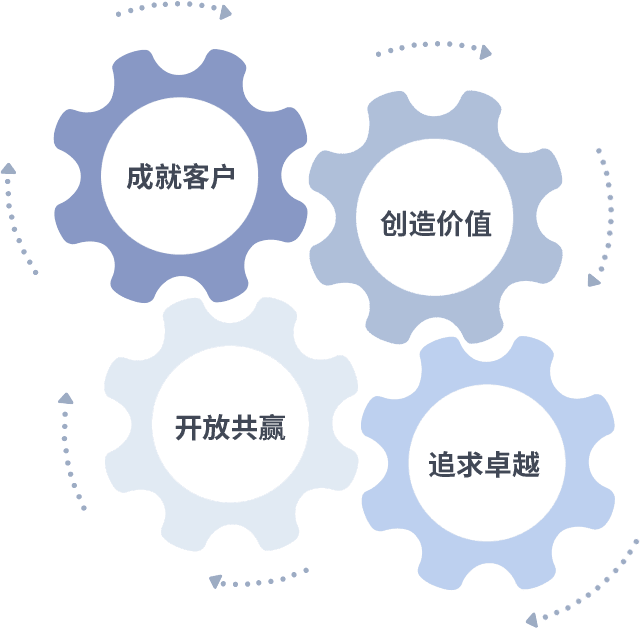 成就客户是一切决策的出发点,,,,创造价值是衡量所有工作的标准,,,追求卓越是庄闲游戏做事做人的态度,,,,开放共赢是庄闲游戏的格局也是最终的结果。。。。价值观的齿轮环环相扣,,推动着组织里的每个人不断向前。。